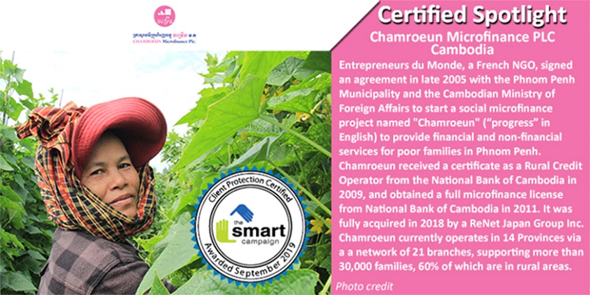 La Smart Campaign, une initiative mondiale visant à intégrer des principes de protection des clients dans le secteur de l’inclusion financière, a publiquement reconnu l’action de Chamroeun, partenaire de la Fondation Grameen Crédit Agricole depuis 2010, en matière de protection des clients en lui accordant la Certification. L’institution rejoint ainsi plus de 115 autres organisations spécialisées dans l’inclusion financière, dans plus de 40 pays, certifiées depuis le lancement du programme en janvier 2013.